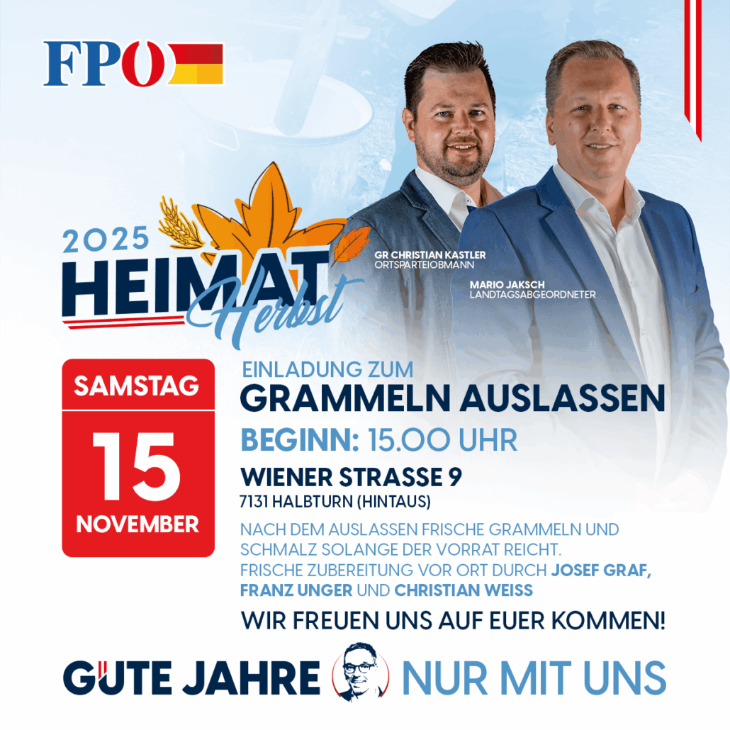Am Samstag, dem 15. November 2025, laden wir herzlich zum Grammeln auslassen ein. Beginn ist um 15.00 Uhr in der Wiener Straße 9, Halbturn (Hintaus).